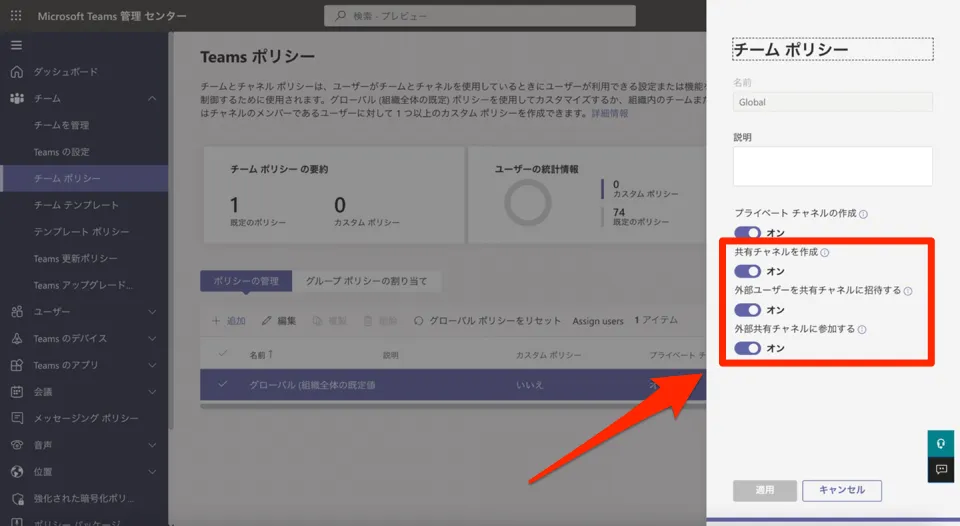 Teamsの管理センターで共有チャンネルのポリシーを設定します。私のテナントではデフォルトで許可をされていましたが、これがオフになっていると、「Teams Connect」を利用することはできません。