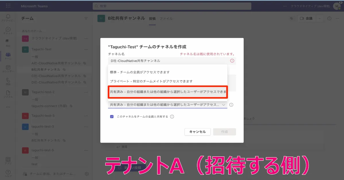 共有チャンネル(Shared Chanel)を作成し、外部ユーザーを招待