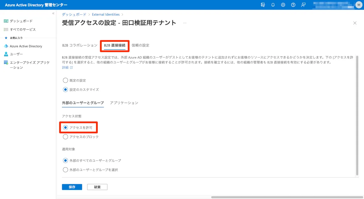 AzureADクロステナントアクセスポリシーで「AzureAD B2B 直接接続(B2B Direct Connect)」を構成します。当社のすかんくが「Azure AD 間の B2B コラボレーション」に関して記事を書いておりますが、厳密には別機能です。(設定箇所は近くにあるので混同しやすいですが。)