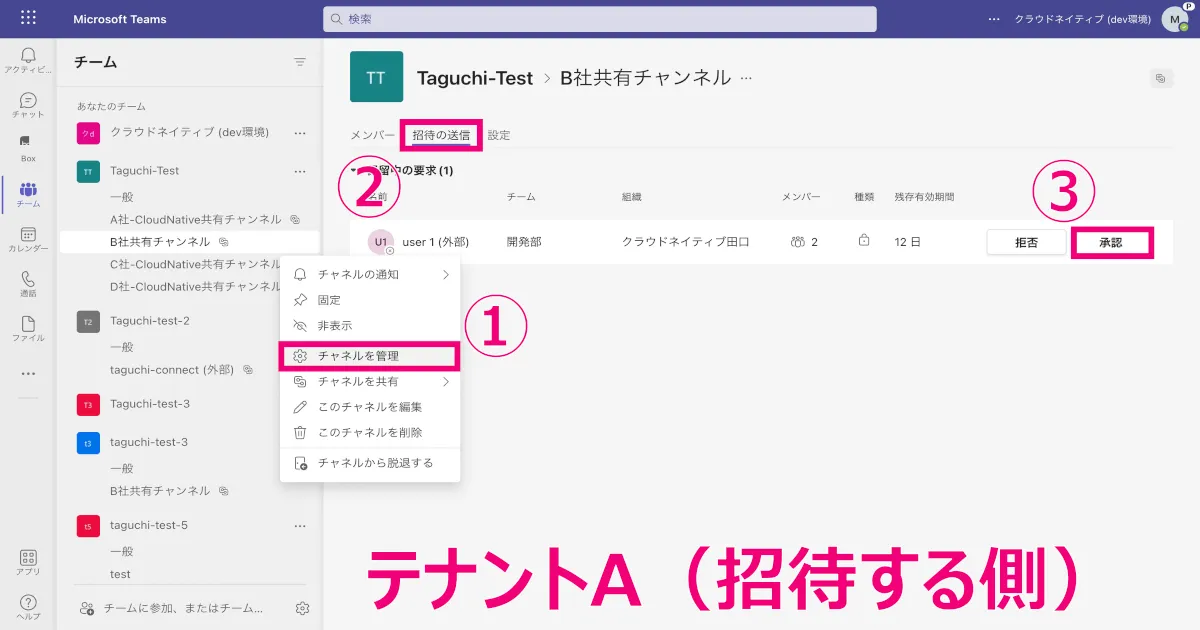 最後に、招待する側のテナント(テナントA)で最終的な承認を行います。[チャンネルを管理] > [招待の送信] から最終的な承認を行うことで、Teams Conectが構成されます。