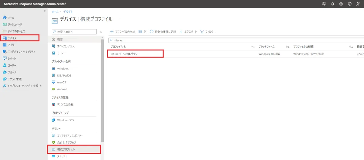 ④ [デバイス] > [構成プロファイル] に移動し、[Intune データ収集ポリシー] が作成されていること・割り当てが適切であることを確認します。