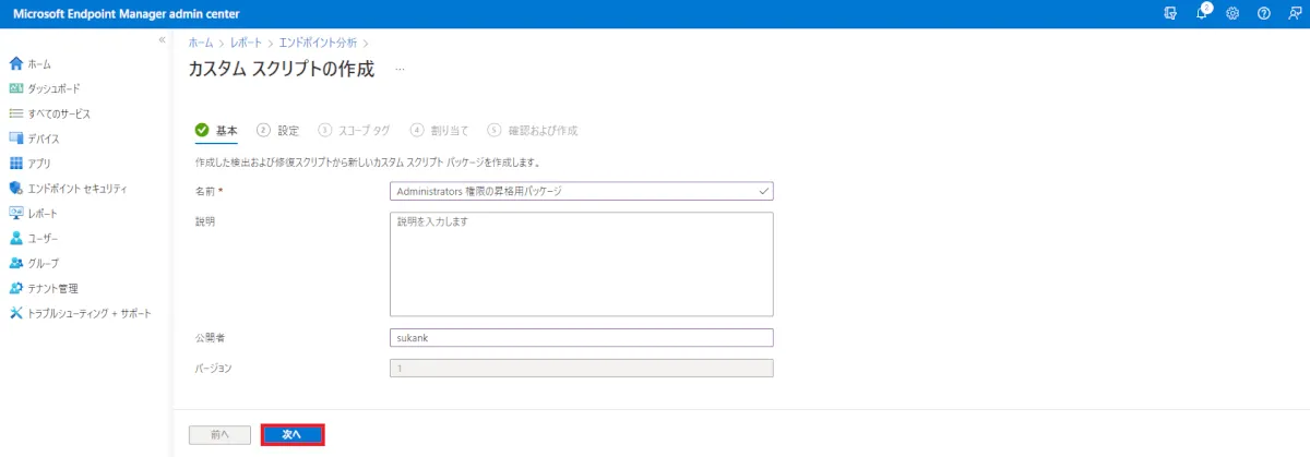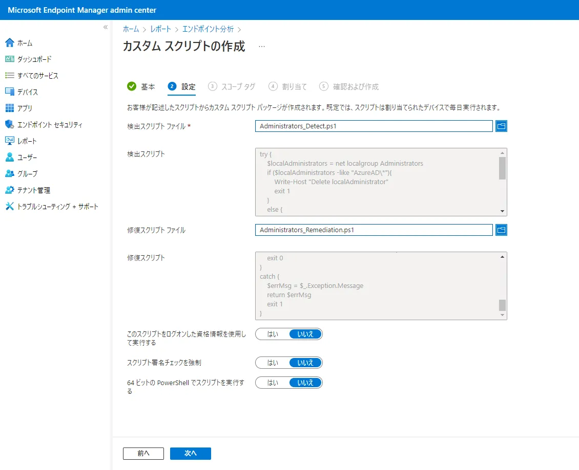 ③ 検出スクリプトファイルに [Administrators_Detect.ps1]を、修復スクリプトファイルに [Administrators_Remediation.ps1] をアップロードし、[次へ] をクリックします。