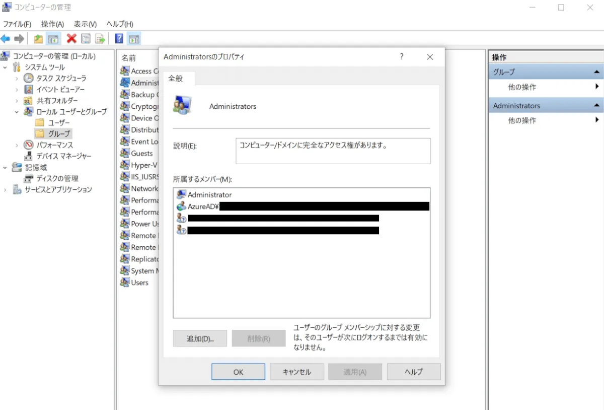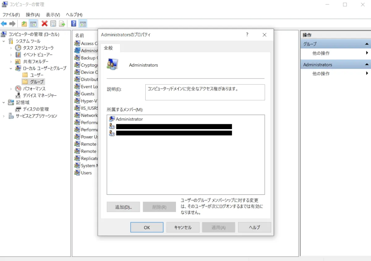 ① [コンピューターの管理] > [ローカルユーザーとグループ] > [グループ] > [Administrators] を開きます。