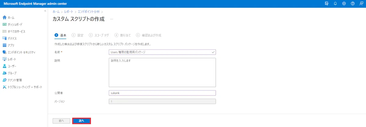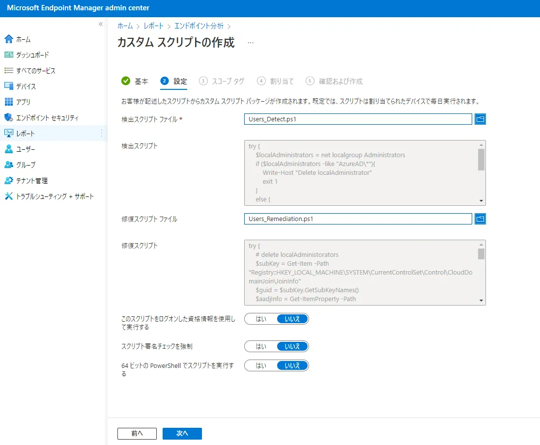 ③ 検出スクリプトファイルに [Users_Detect.ps1]を、修復スクリプトファイルに [Users_Remediation.ps1] をアップロードし、[次へ] をクリックします。