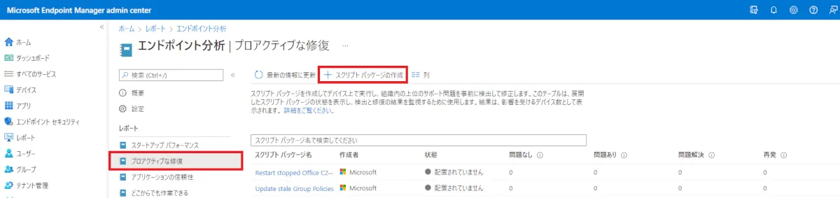① [エンドポイント分析] > [プロアクティブな修復] に移動し、[+スクリプトパッケージの作成] をクリックします。
