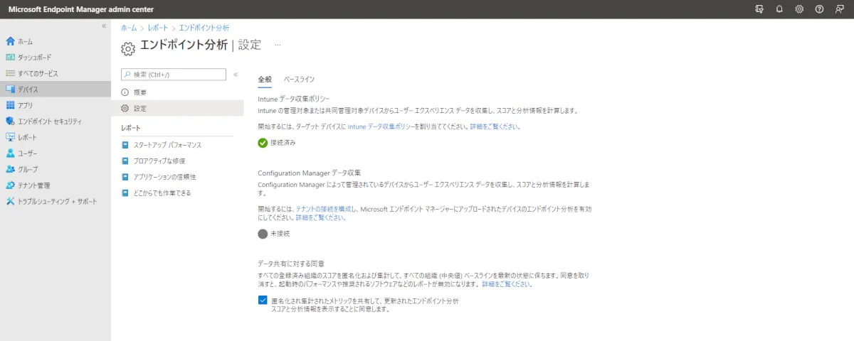 ③ [設定] に移動し、[Intune データ収集ポリシー] が “接続済み” になっていることを確認します。