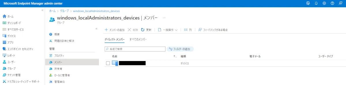 ① [プロアクティブな修復パッケージの登録 – 事前準備 ①] にて作成した、Azure AD セキュリティグループへテスト用デバイスを追加します。