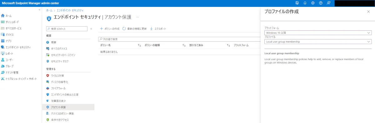 MEM 管理センターの [エンドポイント セキュリティ] > [アカウント保護] から、Azure AD に存在するユーザー/グループを指定して Windows デバイス上の管理者として指定することが可能です。