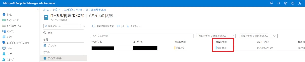 ② [修復の状態] が “問題解決” となっていれば、ローカル Administrators の追加が完了しています。