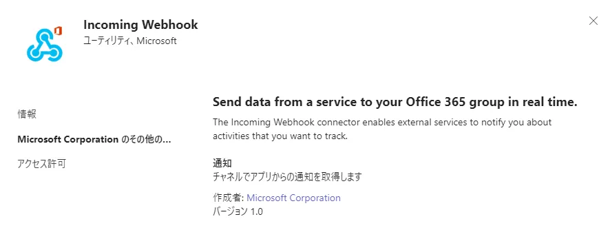 ② 今回は Teams の Incoming Webhook を用いて実行通知を飛ばすため、テスト用 チャネルに Incoming Webhook アプリを追加し、URI を取得しておきます。
