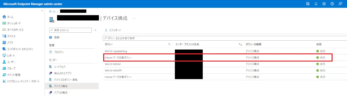 テストデバイスに対して、[Intune データ収集ポリシー] が適用されていることを確認してください。