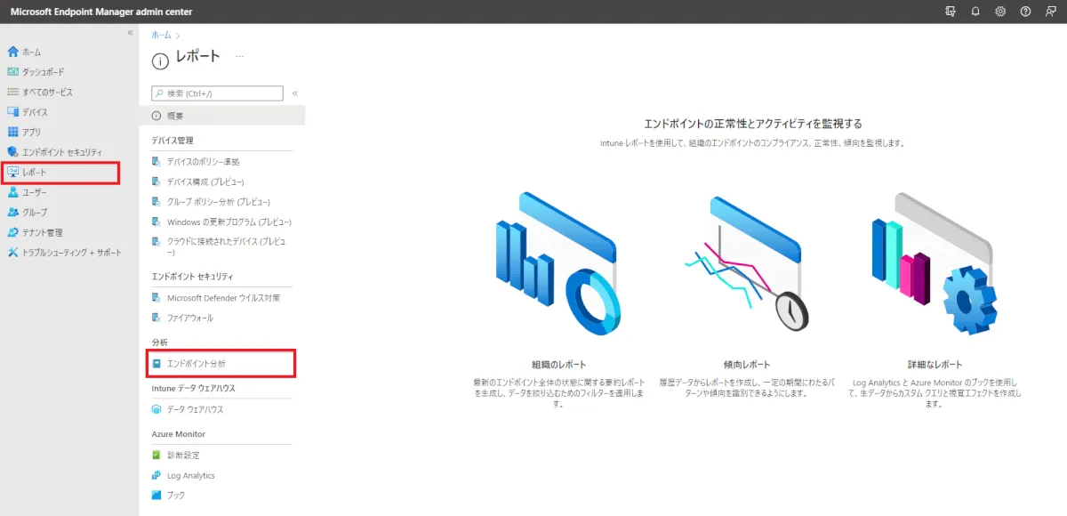 ① MEM 管理センターで、[レポート] > [エンドポイント分析] をクリック。