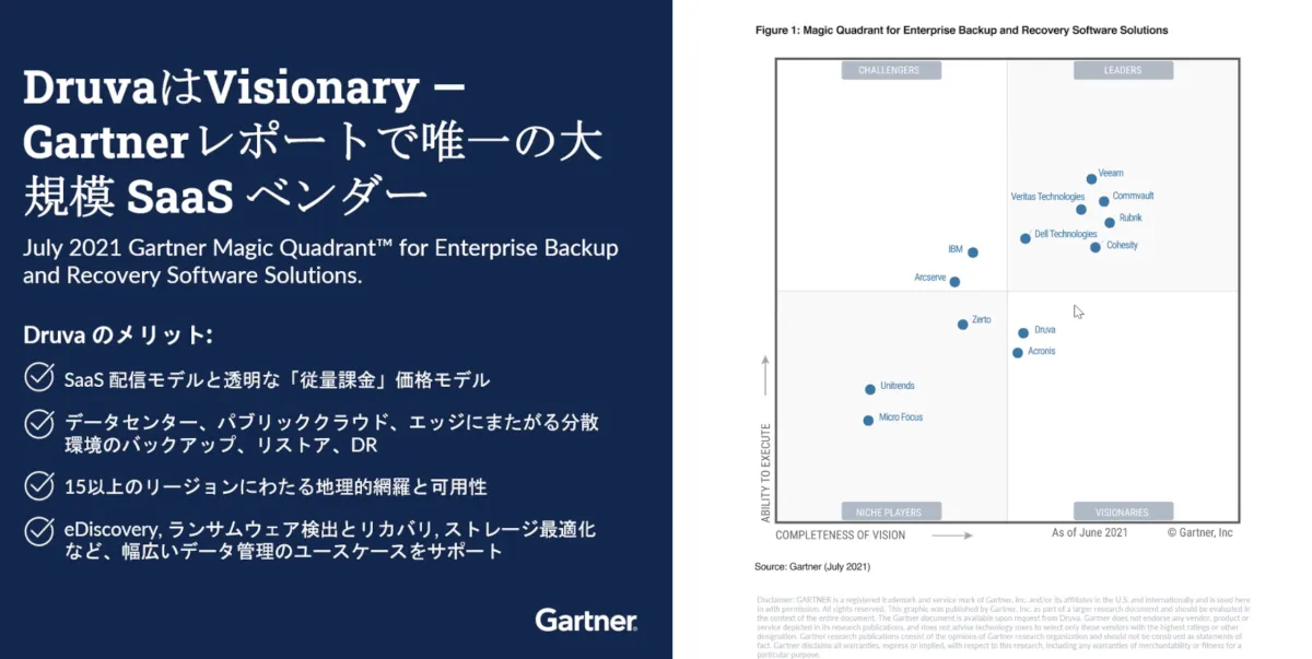 昨年、Gartner社のMagic Quadrantのエンタープライズバックアップとリカバリーソフトウエア製品部門にも掲載されました。