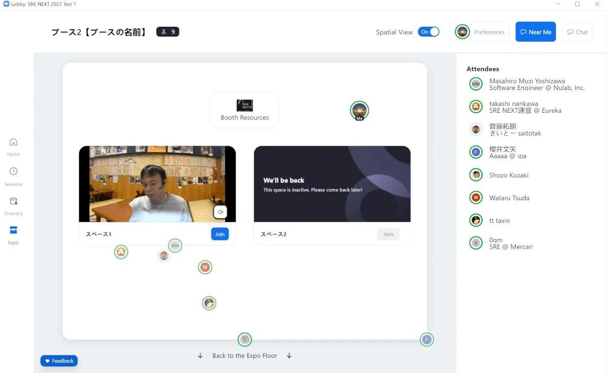 ExpoのBoothの中にSpaceがあります。Spaceというか、これ完全にZoom Meetingです。ホスト側の設定にもよりますが、SpaceにJoinしてきた人がいたら、通知をするとか、待機させるとかいうこともできます。今ちょっと別の人と話してるから待ってね〜っだったり、独自にこの時間から説明会するから来てね〜みたいなこともできます。リアルExpoぽくはありますよね。もちろん、動画を流したり、画像、資料を置くなどができます。