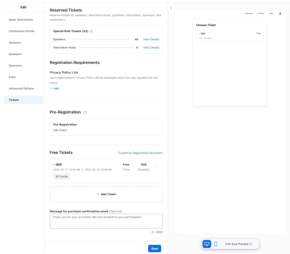 チケットは柔軟な設定と発行ができます。Track Aのみのチケットとか、2日目だけのチケットなどです。ただ、日本国内では有料チケットに対応していないので、チケットを分けることのメリットは現段階ではないと思います。