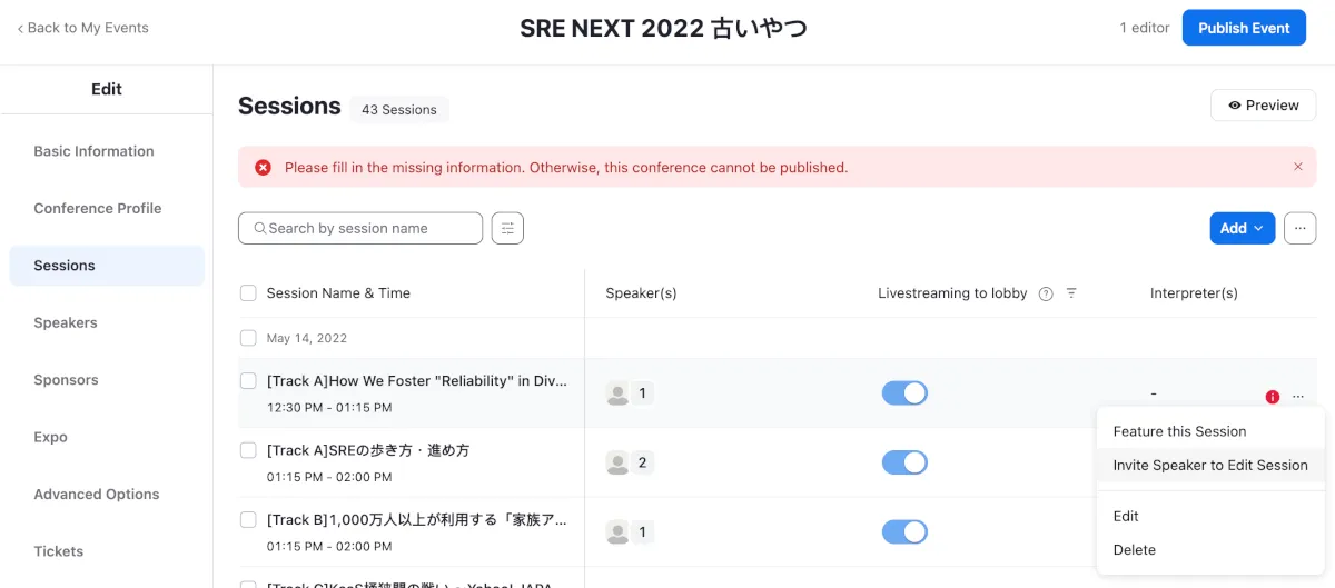 今回のSRE NEXT2022では2日間で45名のスピーカー、42のセッションで構成されています。セッション、およびスピーカーはCSVでの登録が可能です。運営のみなさんがGoogle Form で情報を集め、一気に登録していました。