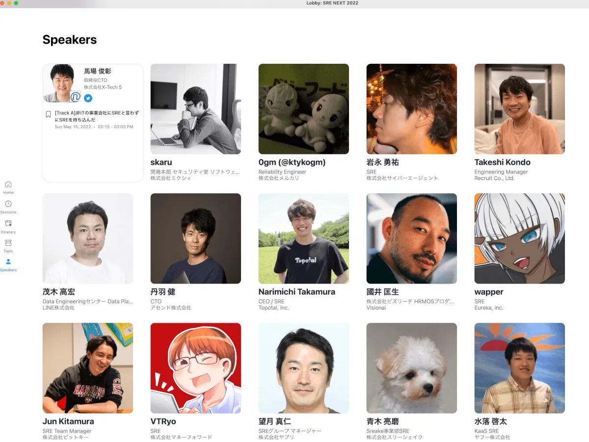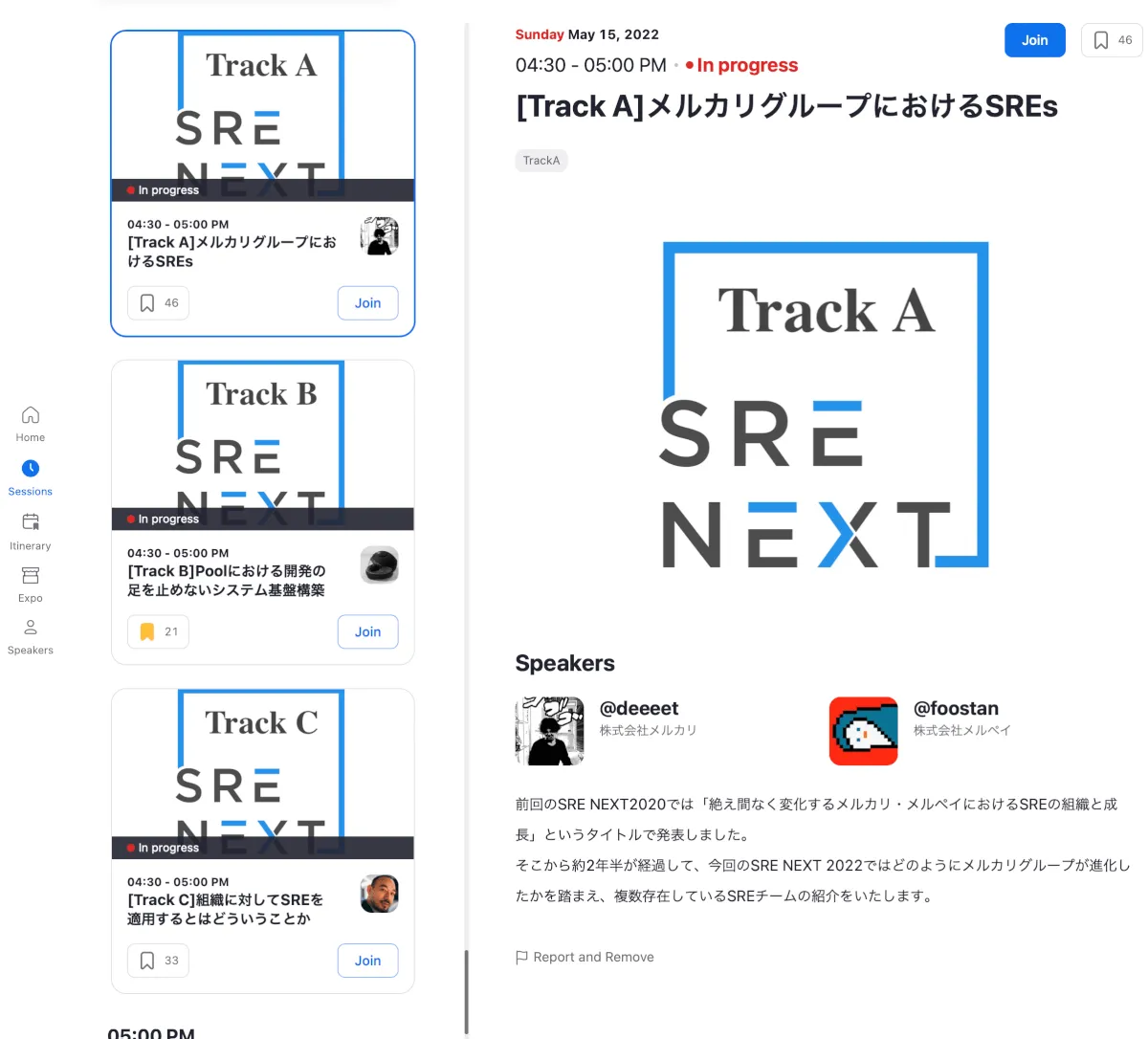Zoomアプリでは少しリッチなUIで、セッション一覧、ユーザー独自のItinerary(視聴スケジュール)、Expo、スピーカー一覧に左端のタブからアクセスできます。