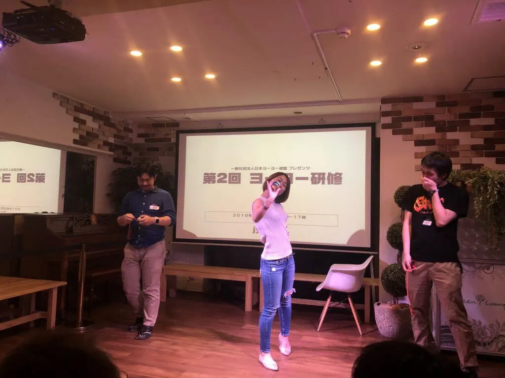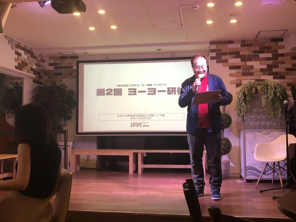 まずは、日本ヨーヨー連盟、代表理事の三居さんによる座学研修!ヨーヨーの歴史や種類などを教わりました。