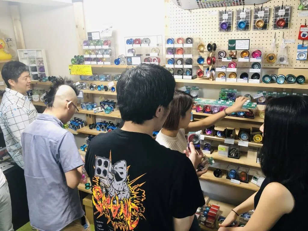 座学を終えて、皆で会場近くのヨーヨーストア「リワインド」へ行き、研修に使うMYヨーヨーをルンルンで選びました。いろんな種類やデザインがあって迷う・・・