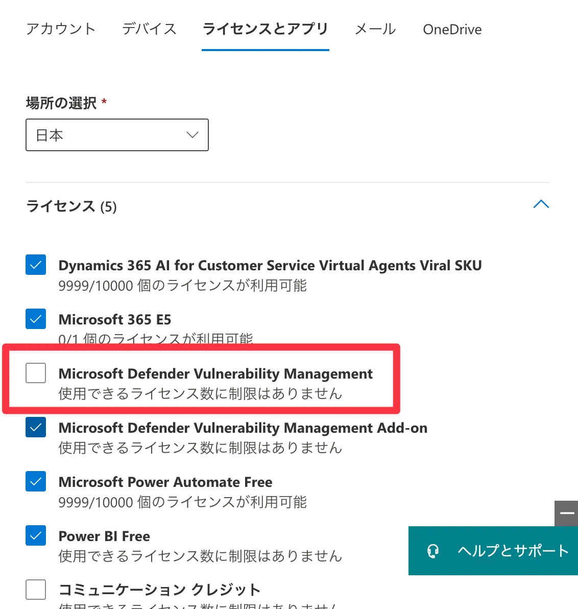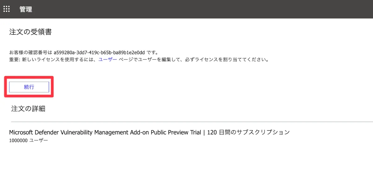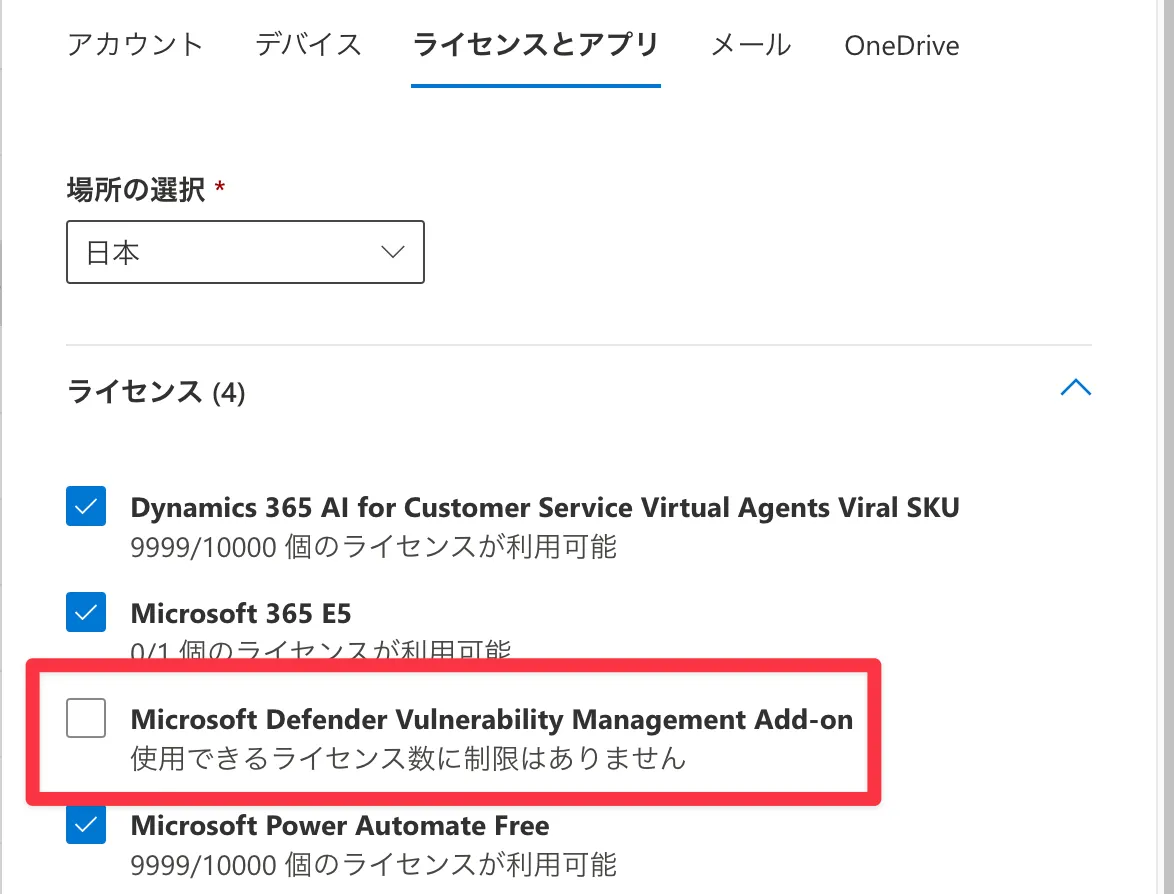 ユーザーのライセンスに、「Microsoft Defender Vulnerability Management」というのが増えていたので、管理者にはこのライセンスを付与しておきます。