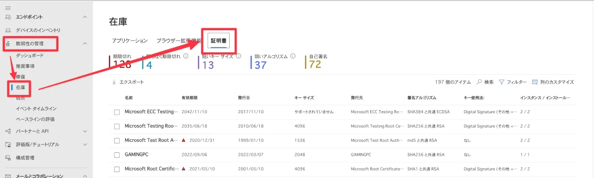 - 「脆弱性の管理」➝「在庫」➝「証明書」タブを選択します。