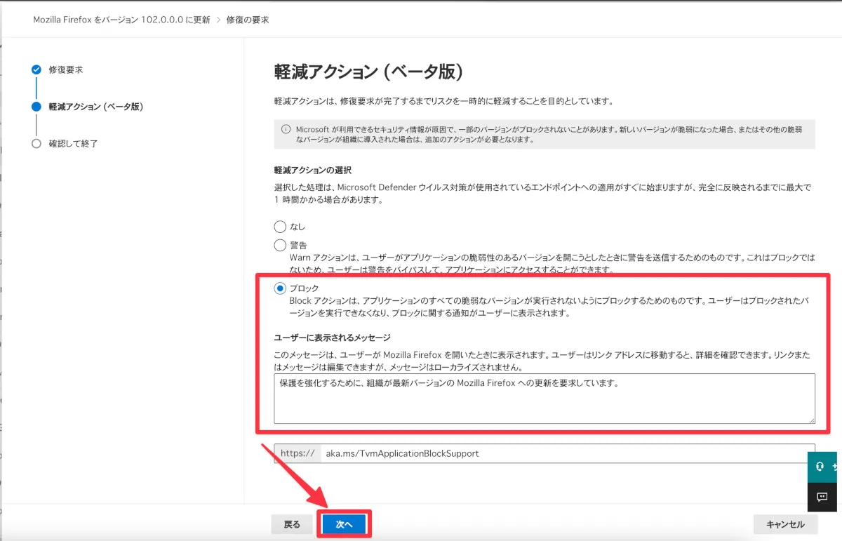 - 「ブロック」を選択し、ユーザーに表示されるメッセージに警告文を入力し、【次へ】をクリックします。