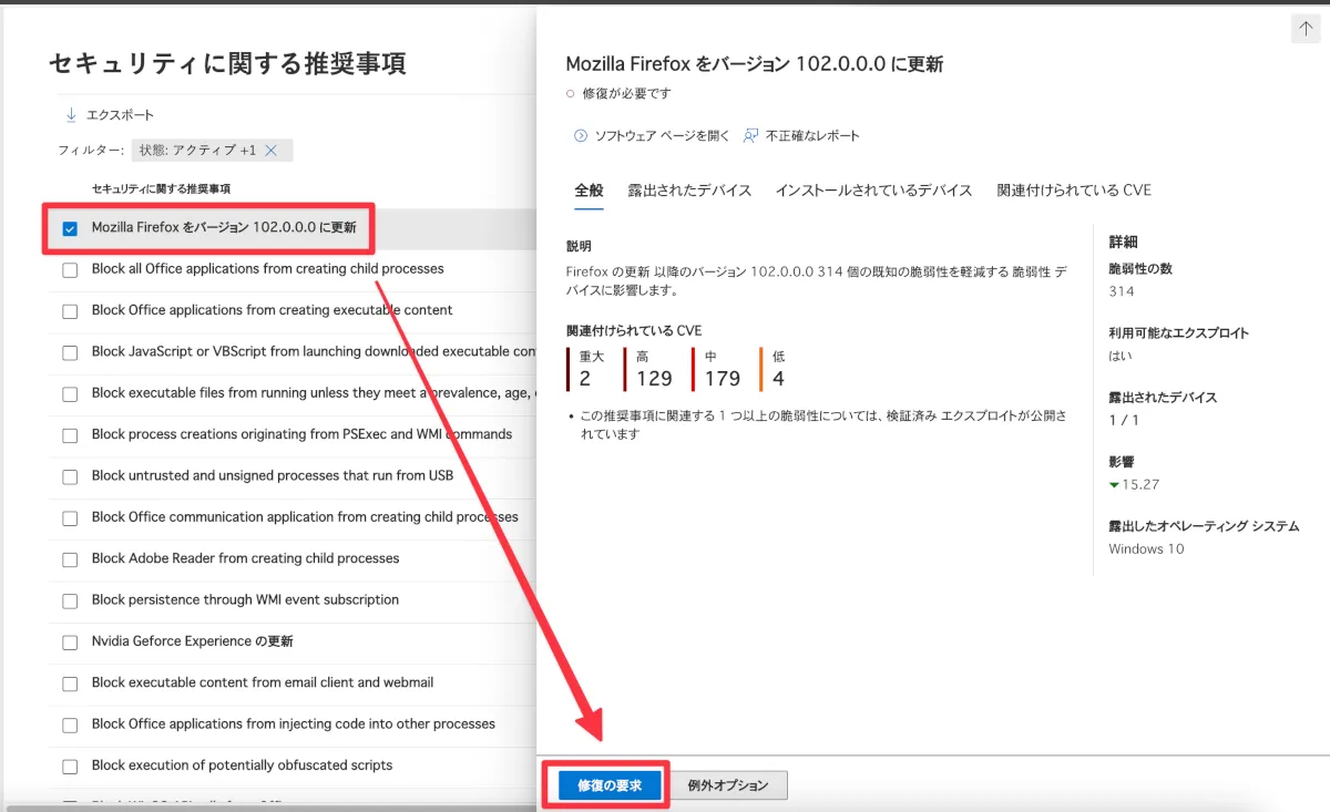 - 「脆弱性の管理」➝「推奨事項」➝「セキュリティに関する推奨事項」に表示されてくるまでしばらく時間がかかるので、表示されてくるまで待ちます。