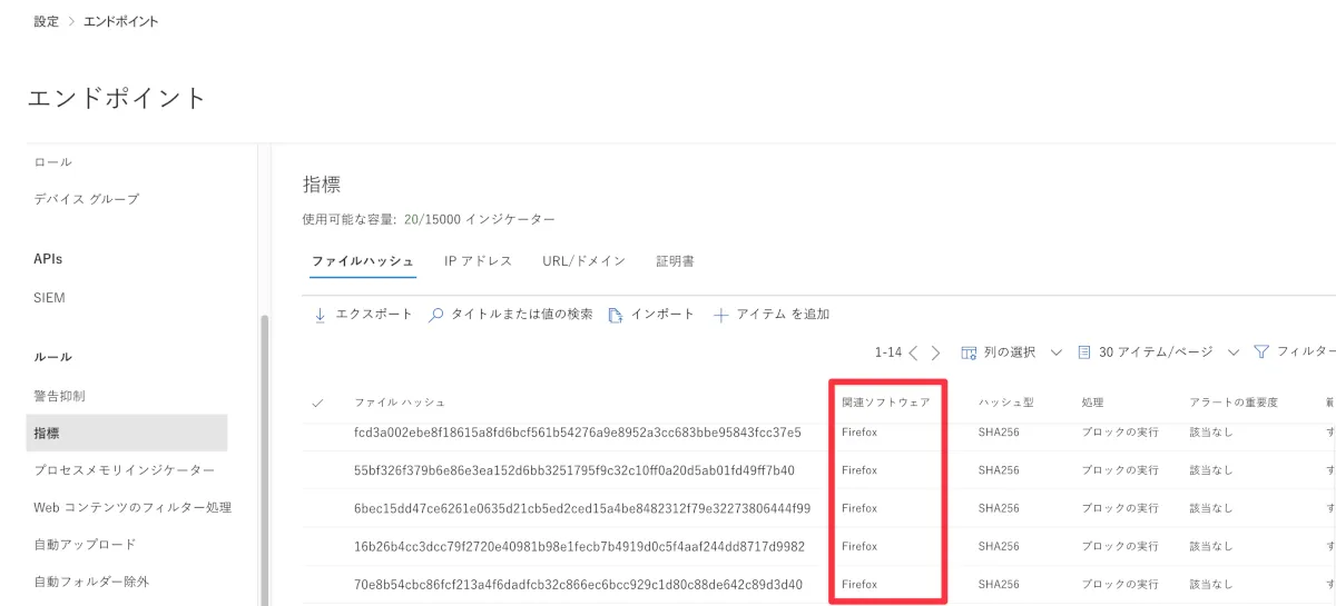 MDEで誤検知したファイル等を登録する際にも利用しますが、「設定」➝「エンドポイント」➝「指標」(英語表記だとindicator)にハッシュ値が登録されます。
