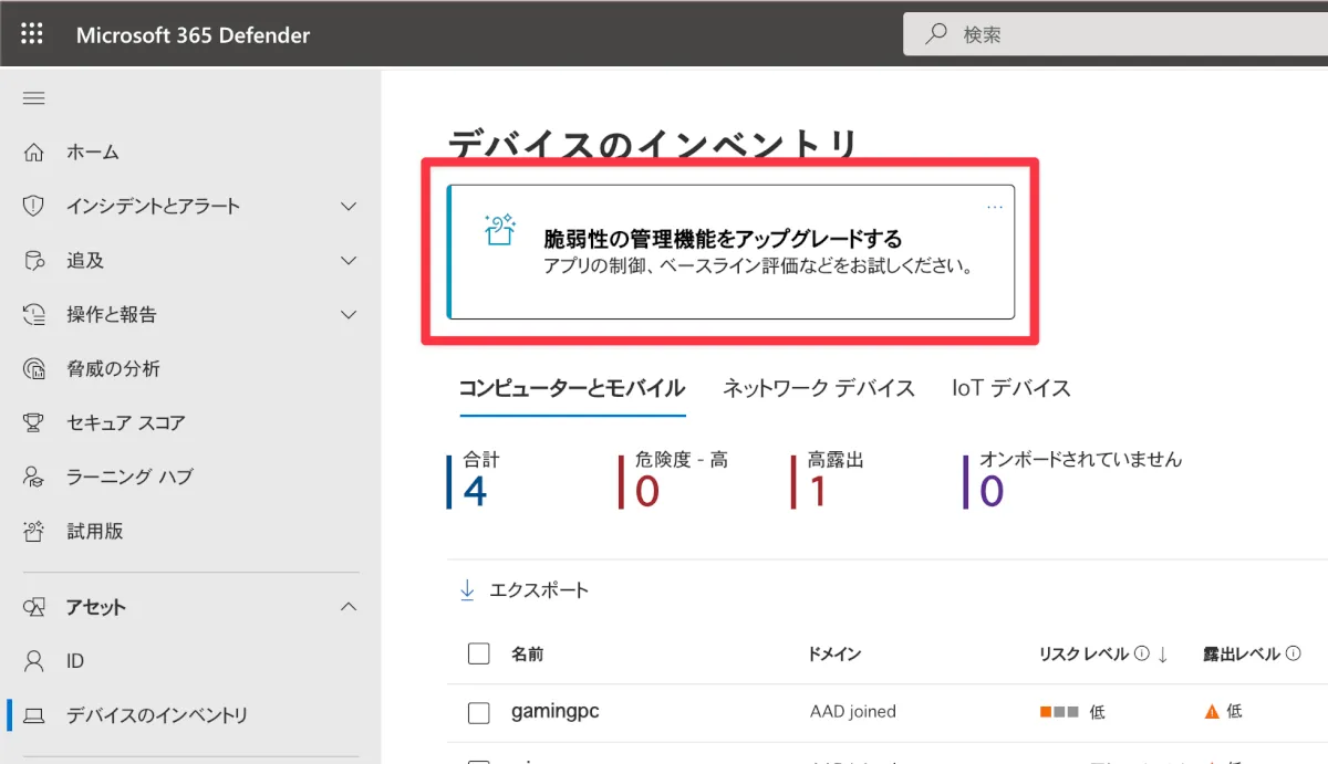 - 【脆弱性の管理機能をアップグレードする】をクリックします。