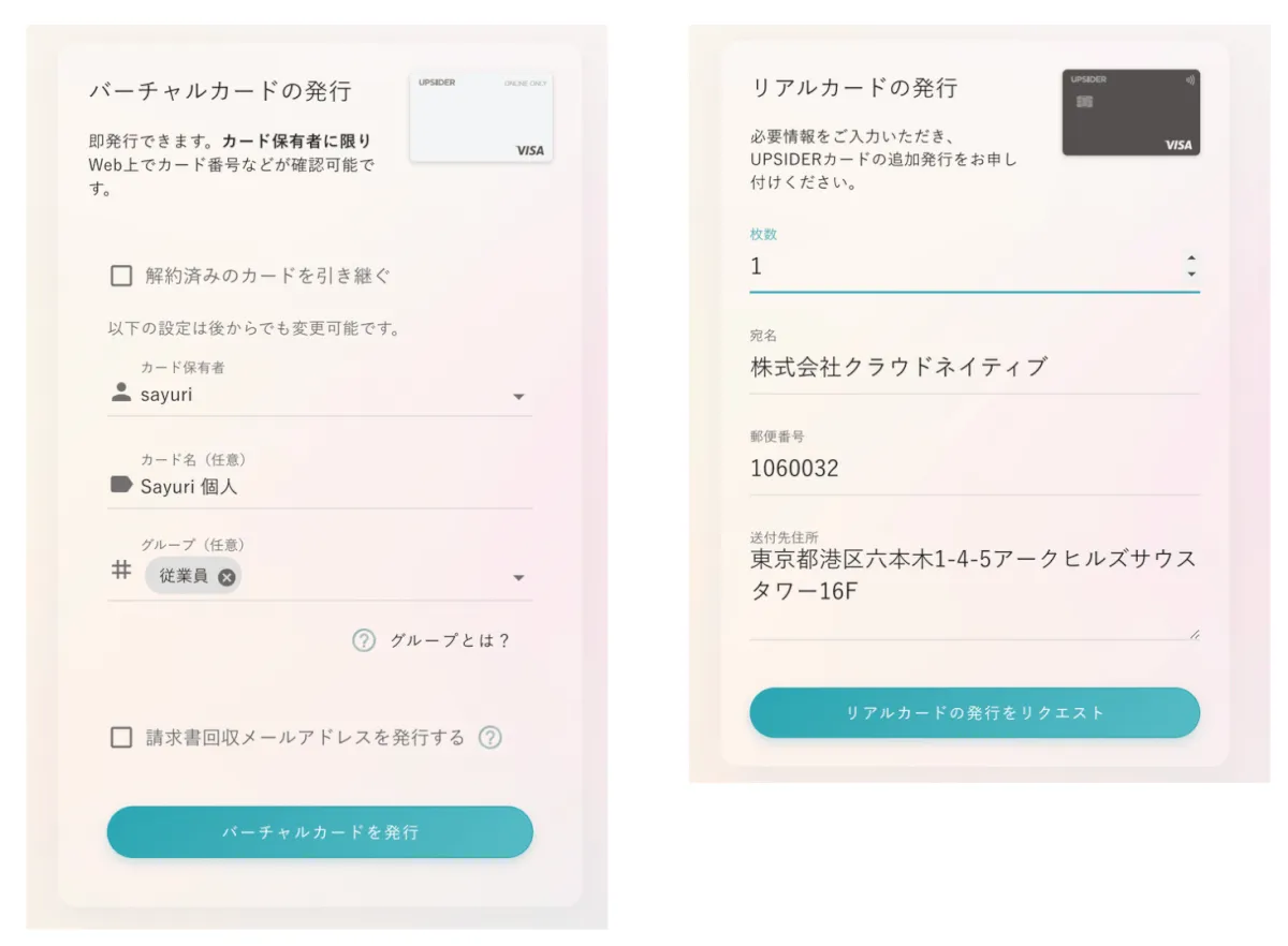UPSIDERにはバーチャルカードとリアルカードが存在します。