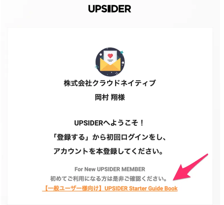 2. ユーザーがアカウント登録をする。(UPSIDERから届くメールにはなんとガイドがついてます)