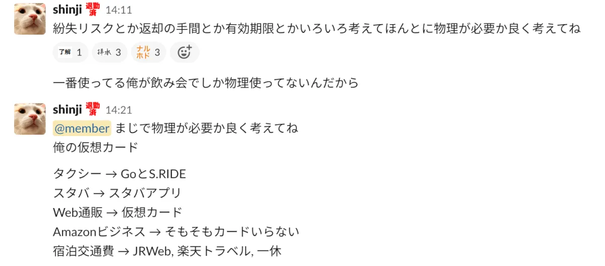 バーチャルカード利用している社員に聞いてみましたが、特に困っていないようです。