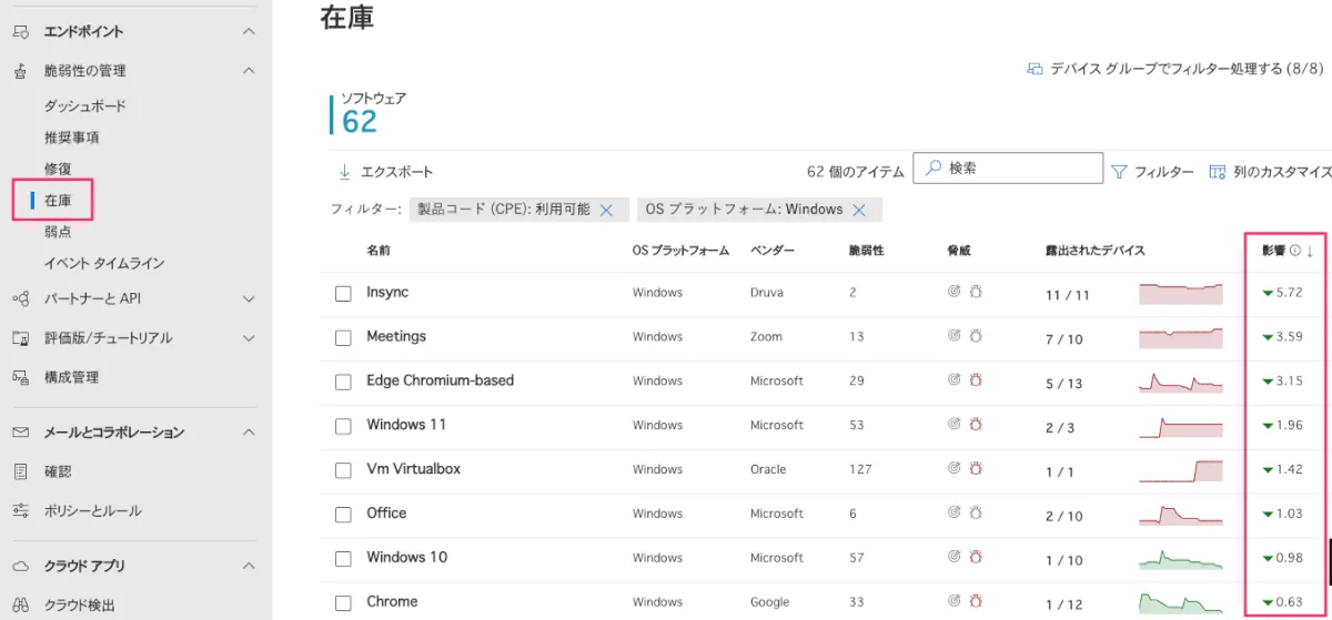 Windows 10などのOS単位でのインベントリもありますが、Chromeなどソフトウェア単位のインベントリもあり、これらに対する影響度を評価してソートしてくれています。上から順にそのソフトウェアへの対応を検討していく事ができます。