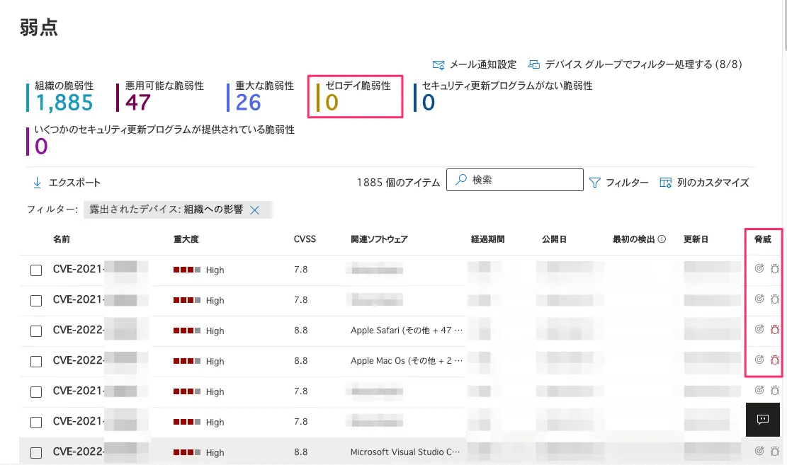 単純な脆弱性の一覧ではなく重大な脆弱性やゼロデイ脆弱性がどれくらいあるかのサマリや、各脆弱性毎にエクスプロイトコードがあるかひと目で分かる「脅威」欄の虫マークなどがあります。しかもこれらはMicrosoft Defender for Endpointの仕組みで収集してきているのでセットアップも簡単です。