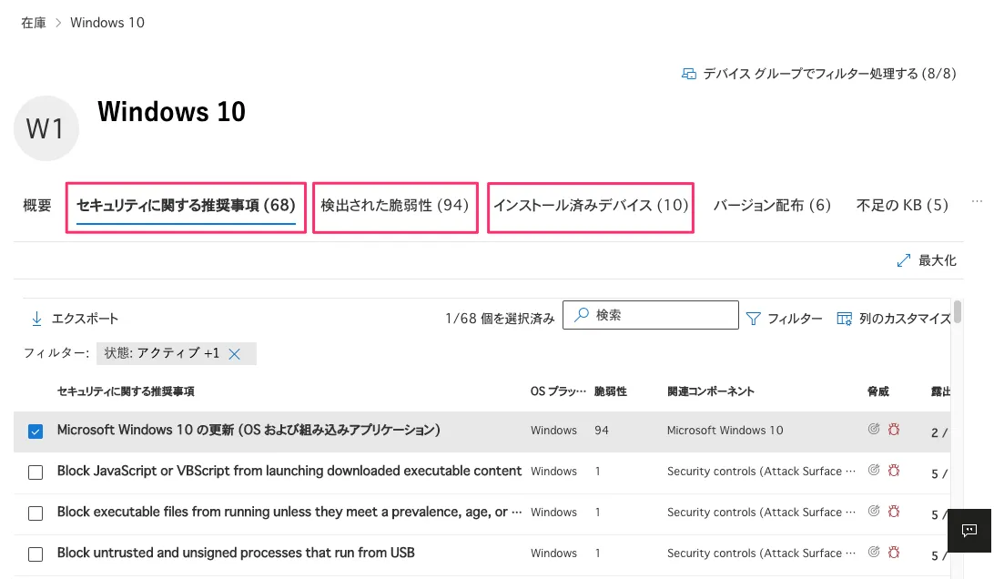 CVEのリストも、旧来は自分たちでNVDなどから集めてきてインベントリと突き合わせるわけですが、最初からそれらの作業が終わった状態で、対象のデバイスや対応優先度までついてこの画面が出てくるのでありがたい限りです。