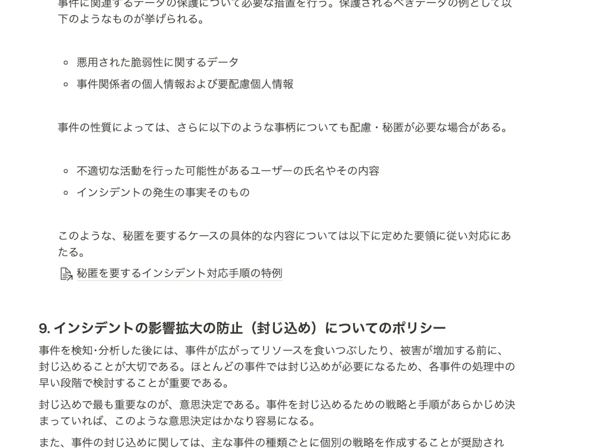 この辺りが疎かになっていると、技術的な対応が終わった後の、報告のとりまとめや訴訟対応などに支障をきたしますし、それ以前に本人の否認に対抗できなくなるケースや、逆に冤罪が生じるケースを防ぐことができます。