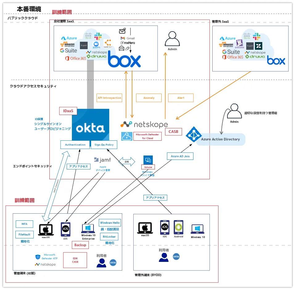 なお、補足ですが、管理外SaaS(右上)からNetskopeに矢印が伸びているのは、管理外のSaaSに対しても、端末にNetskopeエージェントが入っていれば、つまり適切に設定された社給端末であれば、検知できるものもある、ということを表しています。