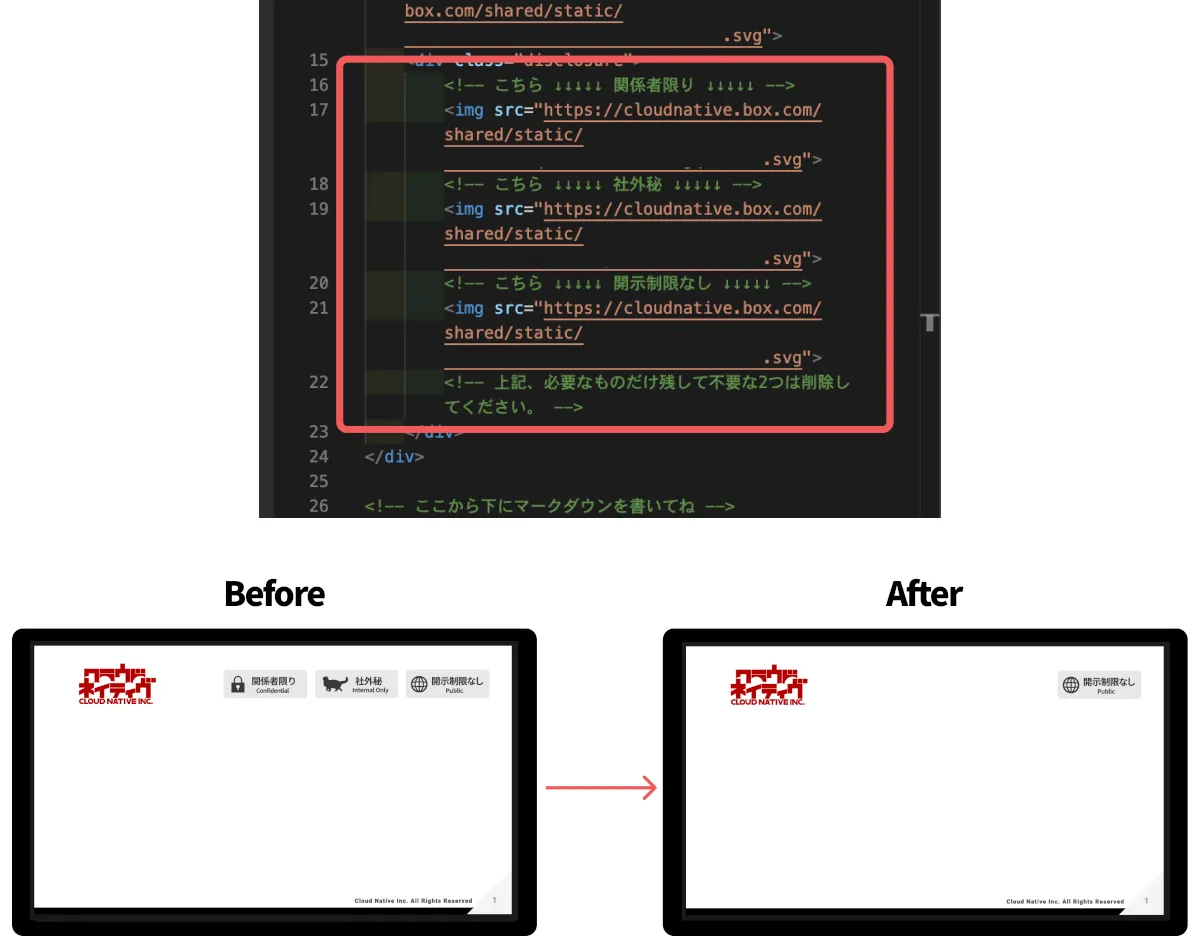 弊社で使用するスライドは全て、関係者限り、社外秘、開示制限なしのいずれかの「公開範囲表記ラベル」が表紙につきます。 これはデフォルトでは3種類全てが表示されているようにし、不必要なラベルに対応するコードを削除してもらうようにしました。この時、わかりやすいようコード量はなるべく短くしたかったので、ラベルはBoxに置いた画像を読み込ませるようにしました。