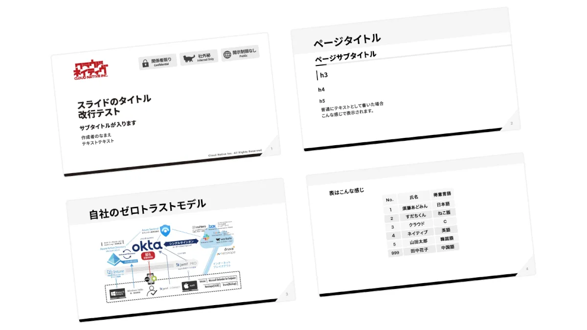 表紙のデザインで、元々パワポで使っている弊社スライドテンプレも完全再現できました。テーマは一度作ってしまえばその後はマークダウン書くだけでスライドが作成されて便利なので、最初だけ少しこだわってみるのも良さそうです。