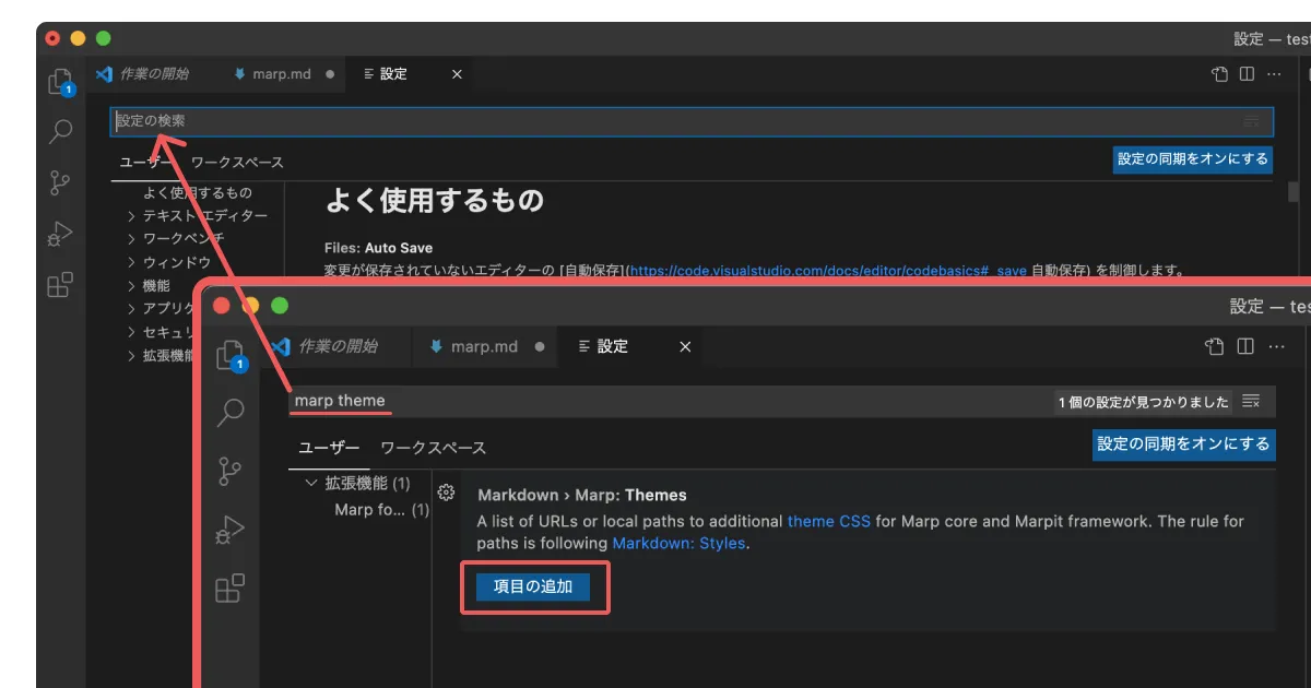 設定画面で「marp theme」と検索して、出てきた「項目の追加」から テーマCSSを追加します。