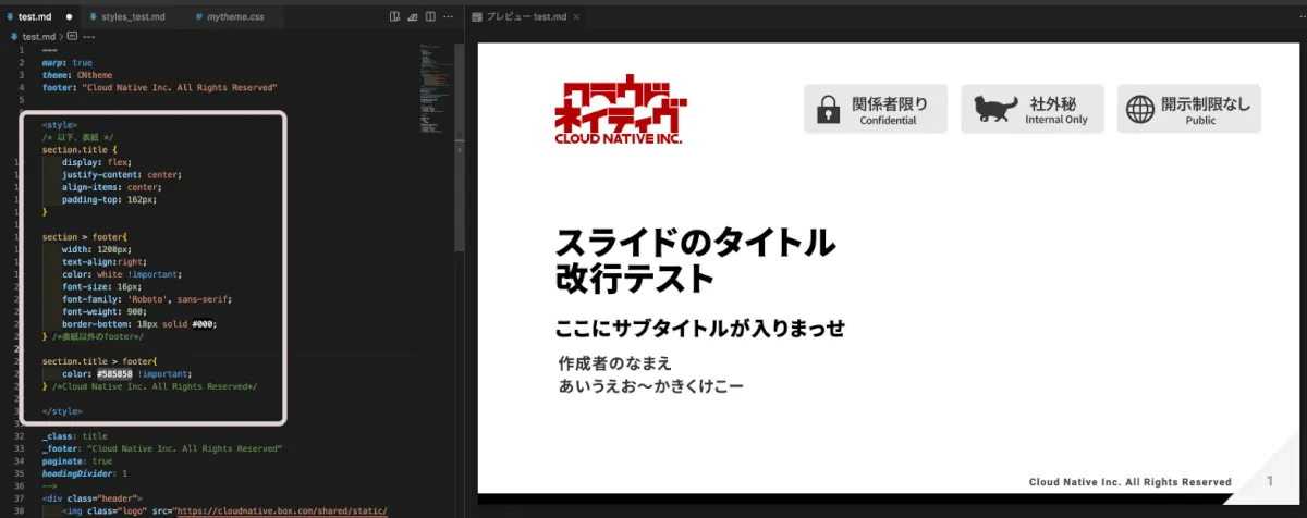 今回はこのCSSファイルをBoxに格納し、Marpを使用する各社員がテーマを簡単に読み込ませるようにしました。
