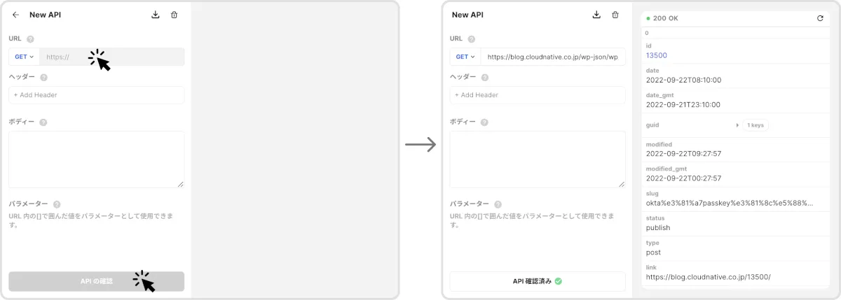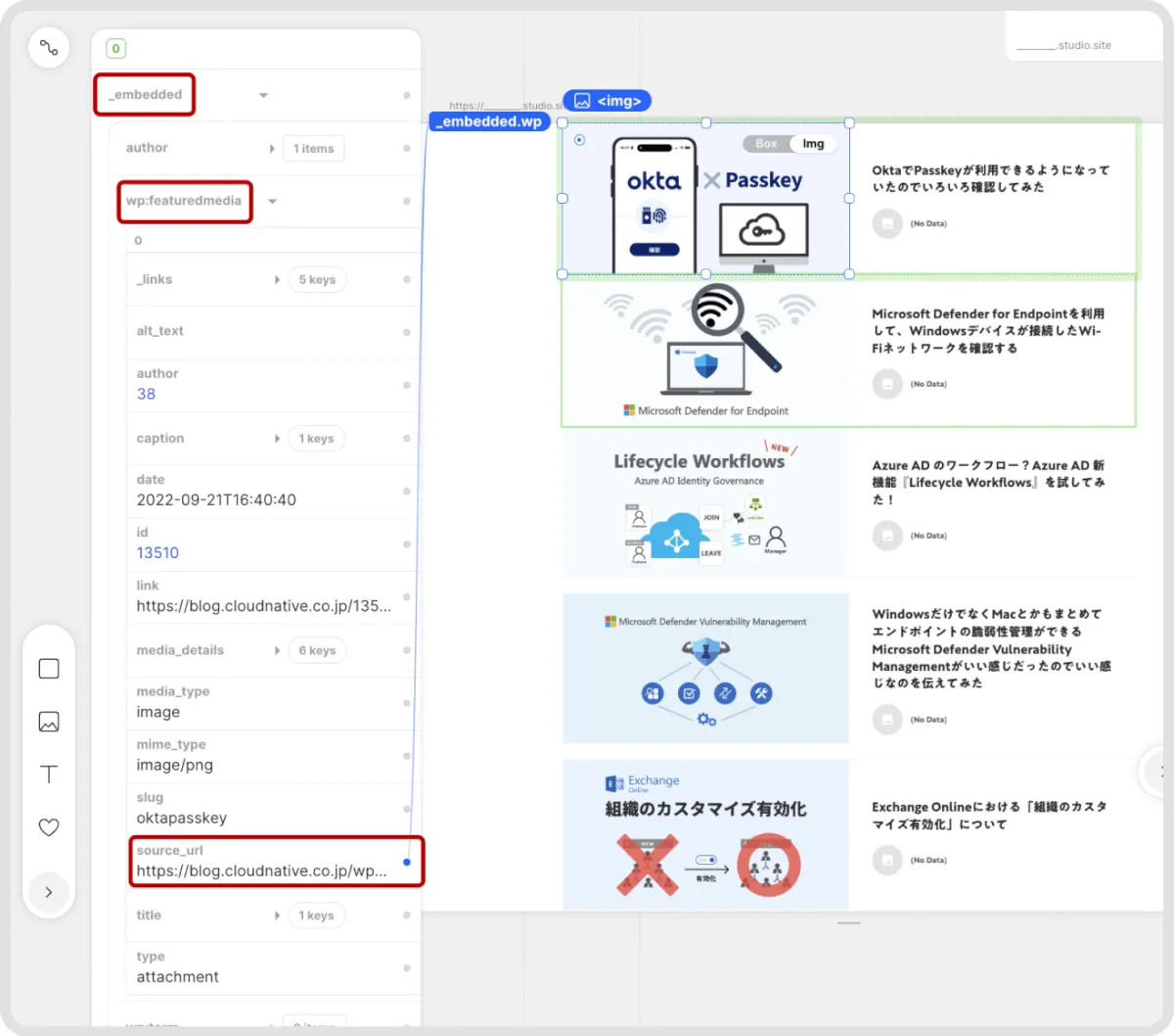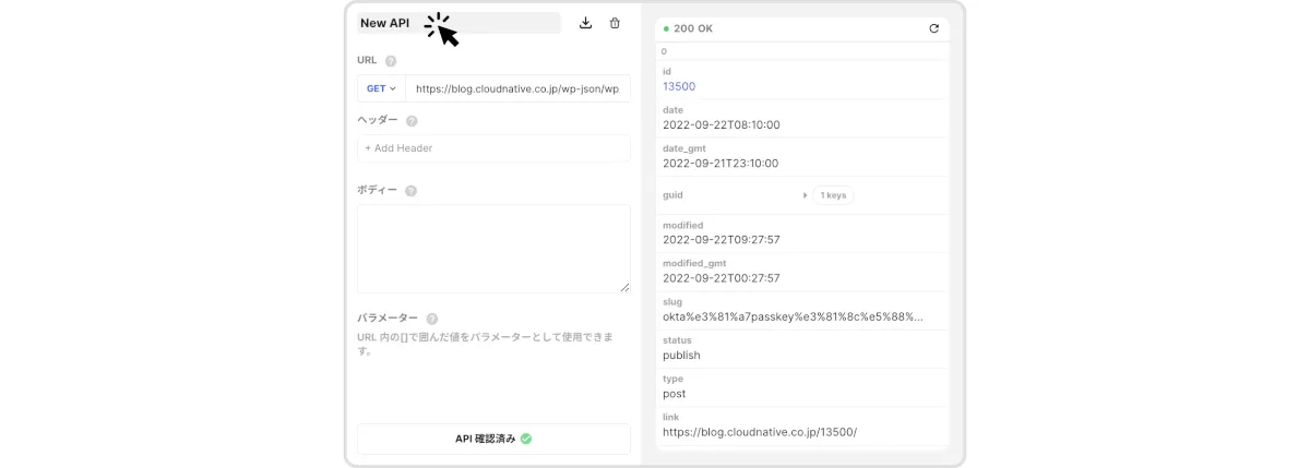 例) クラウドネイティブブログの場合:https://blog.cloudnative.co.jp/wp-json/wp/v2/posts?_embedとなります。