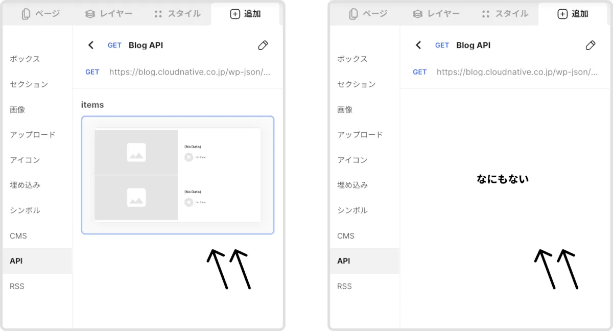 左サイドバーの追加したAPI下に「items」というパーツがあるので、エディタ上にドラッグして終わりなのですが・・・