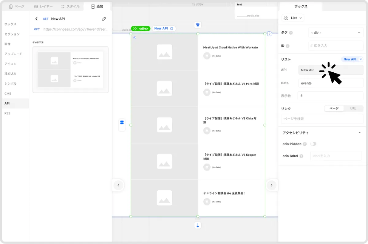 例として、まず弊社のconnpassを使ってAPIを追加連携していきます。みなさまもコピペで使っていただいて大丈夫ですのでご心配なく!!やり方はさきほどの「1. STUDIOエディターでAPIを追加する」と同じ要領で、URL部分をhttps://connpass.com/api/v1/event/?series_id=9127&count=50にしてください。