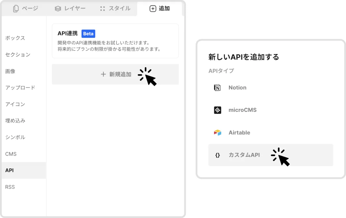 STUDIOの左サイドバーから、追加>API>新規追加>カスタムAPI を選択します。