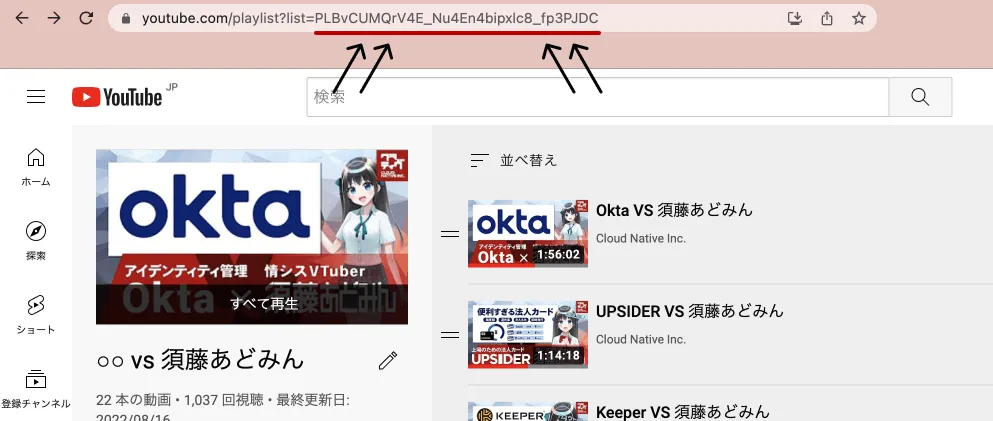 例)クラウドネイティブYouTube 再生リスト「○○ vs 須藤あどみん」の動画を20件取得する場合