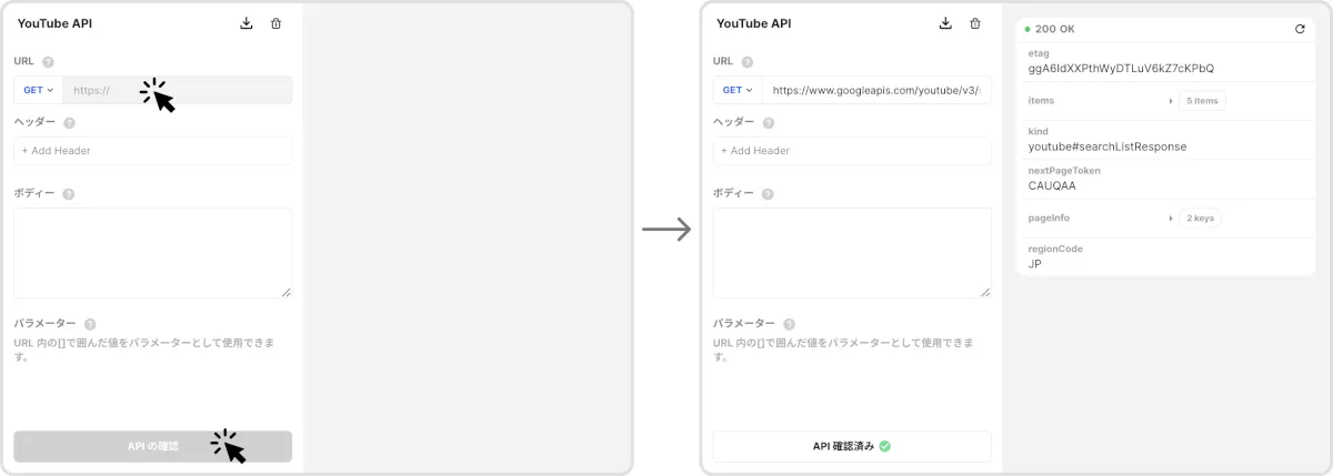 URL項目部分に、https://www.googleapis.com/youtube/v3/search?part=snippet&channelId=<チャンネルID>&maxResults=<何件取得するかの数字>&order=date&type=video&key=<API Key>を入力します。当たり前ですが、< >は消してくださいねw