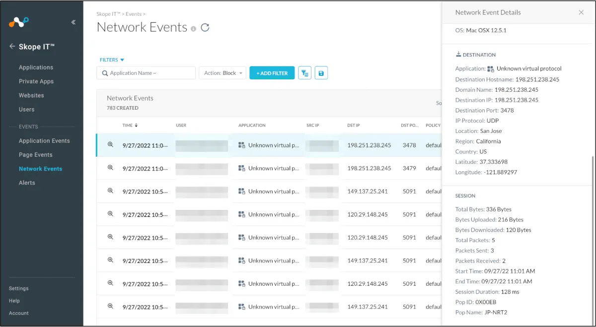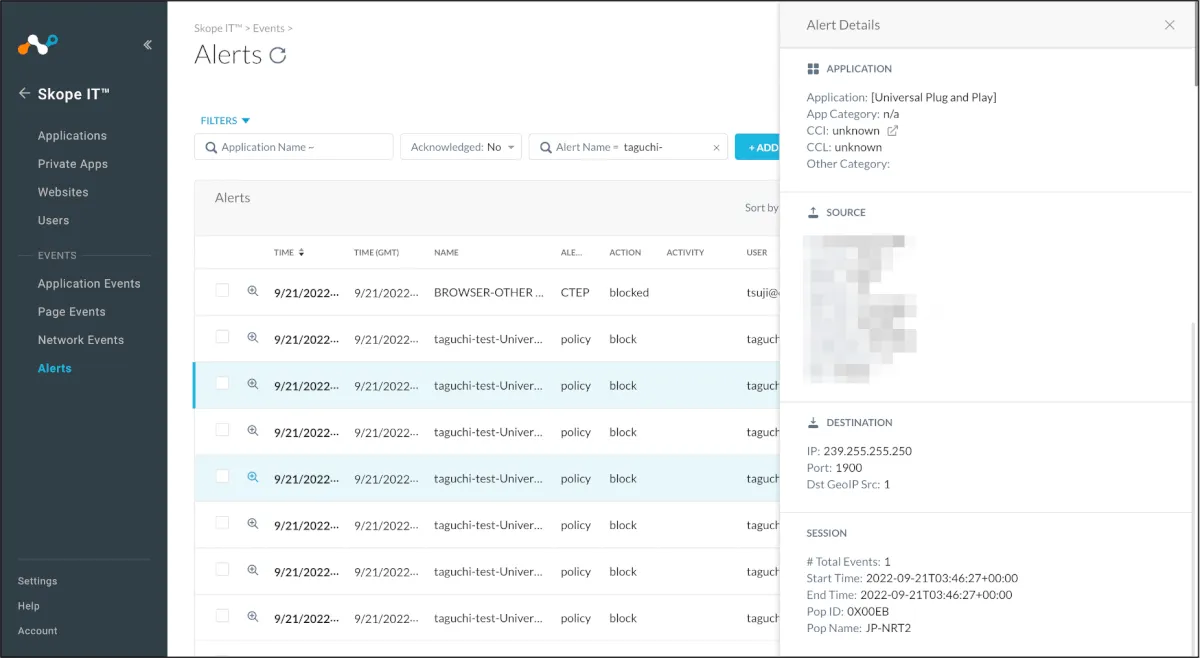上記「ポリシー(許可・ブロック)の組み方」で紹介した方法でブロックした場合は、[ScopeIT] > [Alerts]にブロックのログが上がってきます。