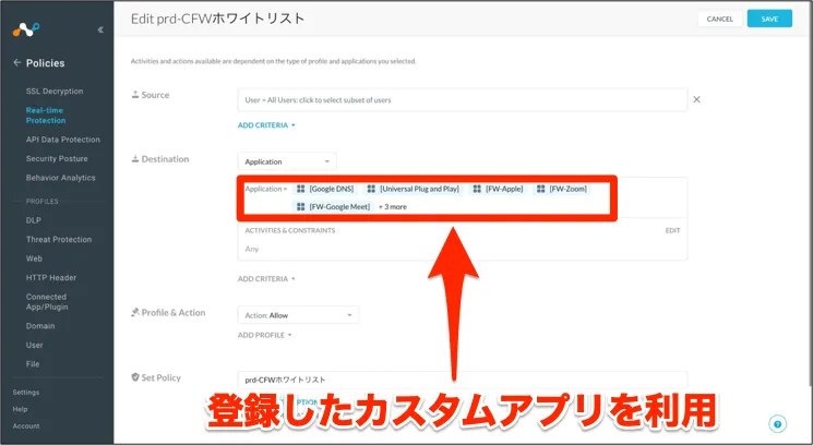 登録したカスタムアプリを指定し、Real-time Protectionにて許可・ブロックを入れることで、ポリシーを組むことができます。