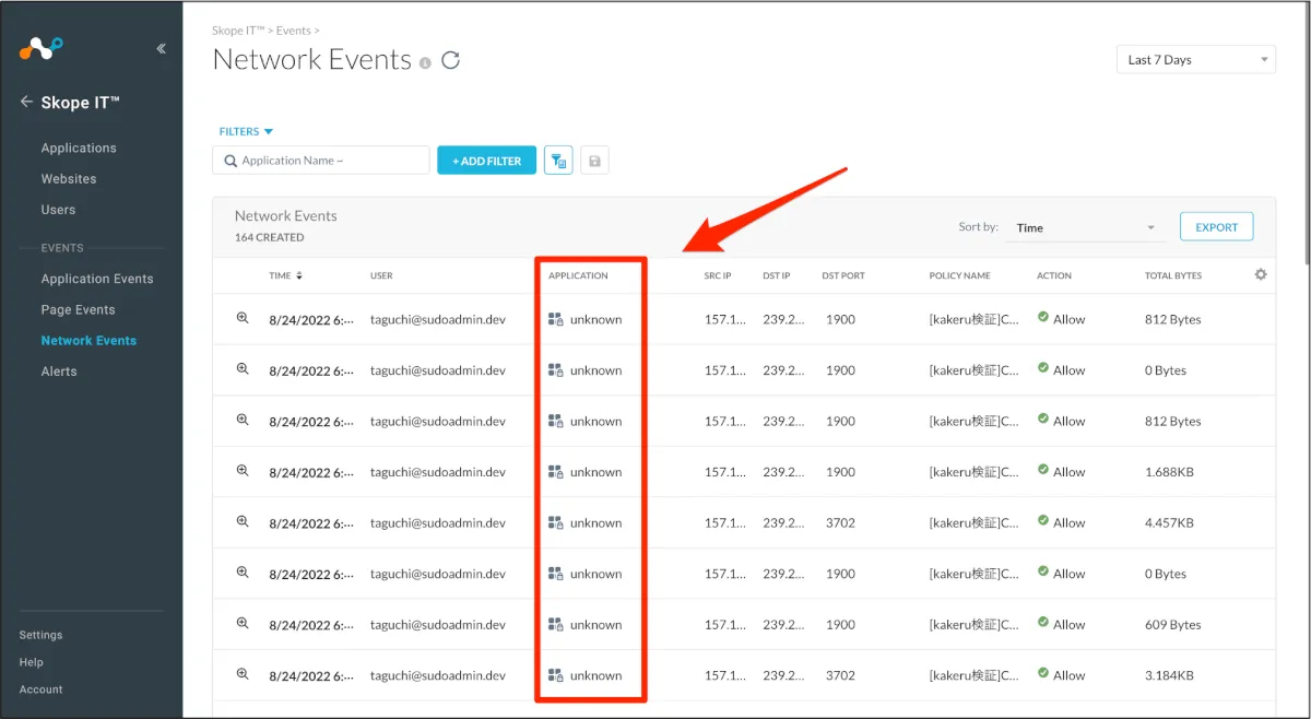 ただし、Network Eventsのトップ画面の[APPLICATION] 欄は、デフォルトでは「unkown」と表示されています。